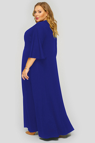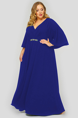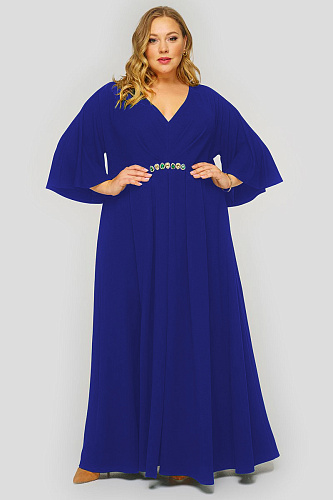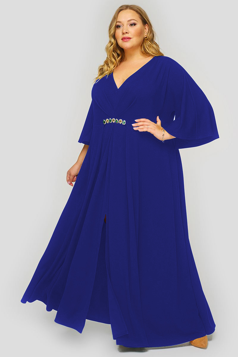 Длинное вечернее платье из эластичного крепа. V-образный вырез горловины. Рукав расклешенный, цельнокроенный. Юбка отрезная, с мягкими складками по талии и разрезом по центру передней половинки. По центру переда пришивное украшение в виде кристаллов. Ткань:креп с эластаном, состав: 65% - вискоза, 25% полиэстер, 10%-эластан. Цвет: васильковый * длина изделия = 143 см по спинке от плеча. дизайн и размер пришивного украшения может меняться. * соответствует измерениям базовых размеров 58 - 62