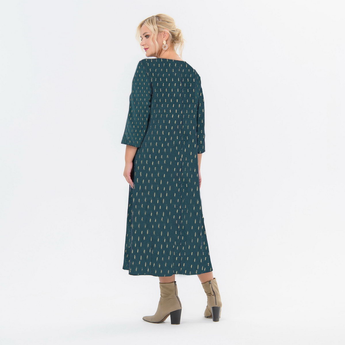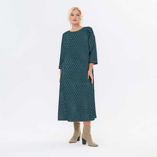 Платье полуприлегающего силуэта, немного расширенное по бедрам, из джерси средней плотности, имитирующего ангору. Комфортное, за счет мягкости ткани и отработанной конструкции. Рукав 3/4. Вырез горловины "лодочка". Платье выполнено из нового артикула джерси, имитирующего ангору, с золотистым напылением. Мягкая, нежная, комфортная и шелковистая ткань, очень лёгкая, почти невесомая; не колет, не мнется. Ткань –джерси, состав: 67% полиэстер, 30% вискоза; 3% эластан. Цвет - зеленый. * длина изделия по спинке 122 см. На модели представлен 56 размер. Параметры модели: - рост 175 см - обхват груди 110 см - обхват бедер 112 см.
