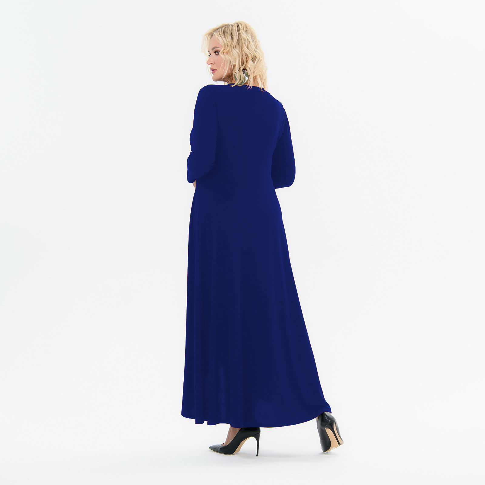 Платье приталенное из струящегося трикотажа "масло". Верхняя часть отрезная, с запАхом. Юбка немного расклешенная, асимметричная. Рукав длинный. Ткань –трикотаж "масло", состав: 70% полиэстер, 25% вискоза; 5% эластан. Цвет - васильковый. * длина изделия по спинке 135 см на модели представлен 56 размер. Параметры модели: - рост 175 см - обхват груди 110 см - обхват бедер 112 см.