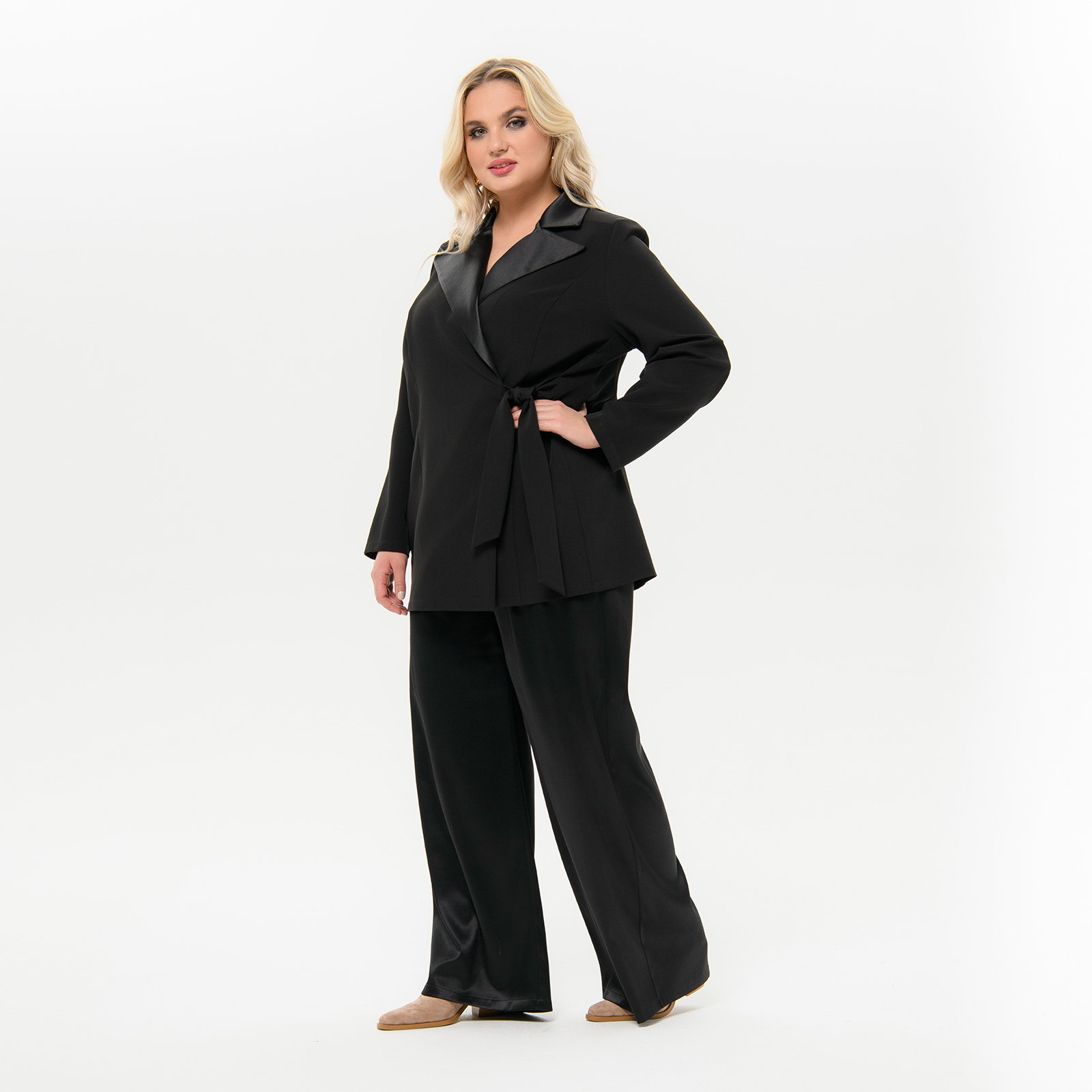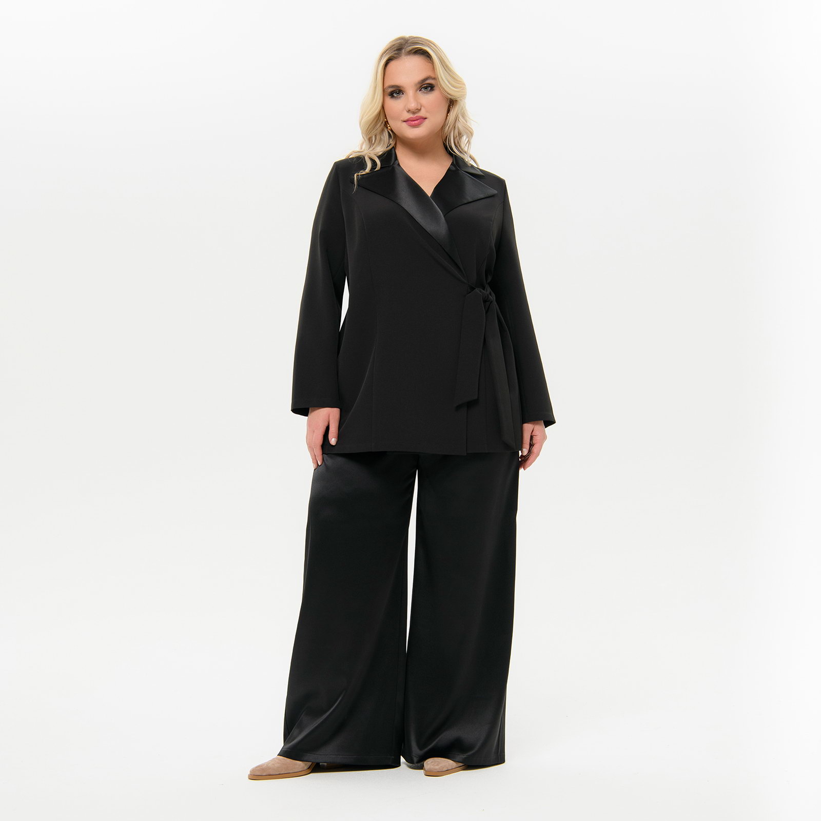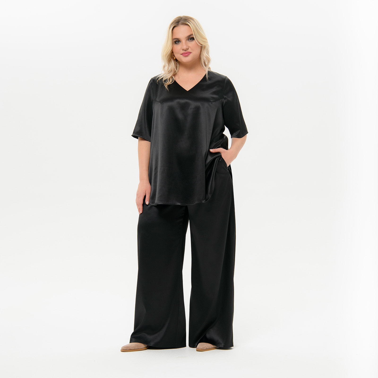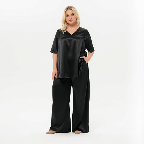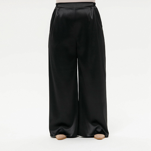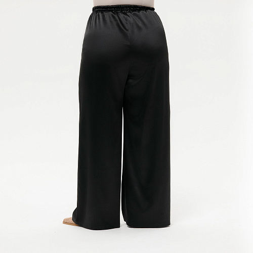 Стильные широкие брюки "палаццо" из плотного атласа с эластаном. В боковых швах карманы. Верх на резинке шириной 3,5 см . Ткань - атлас, 97% полиэстер, 3% эластан. Цвет - черный Длина изделия - 114 см по боковому шву вместе с поясом - резинкой. Рост модели 172 см. На модели представлен 58 размер.