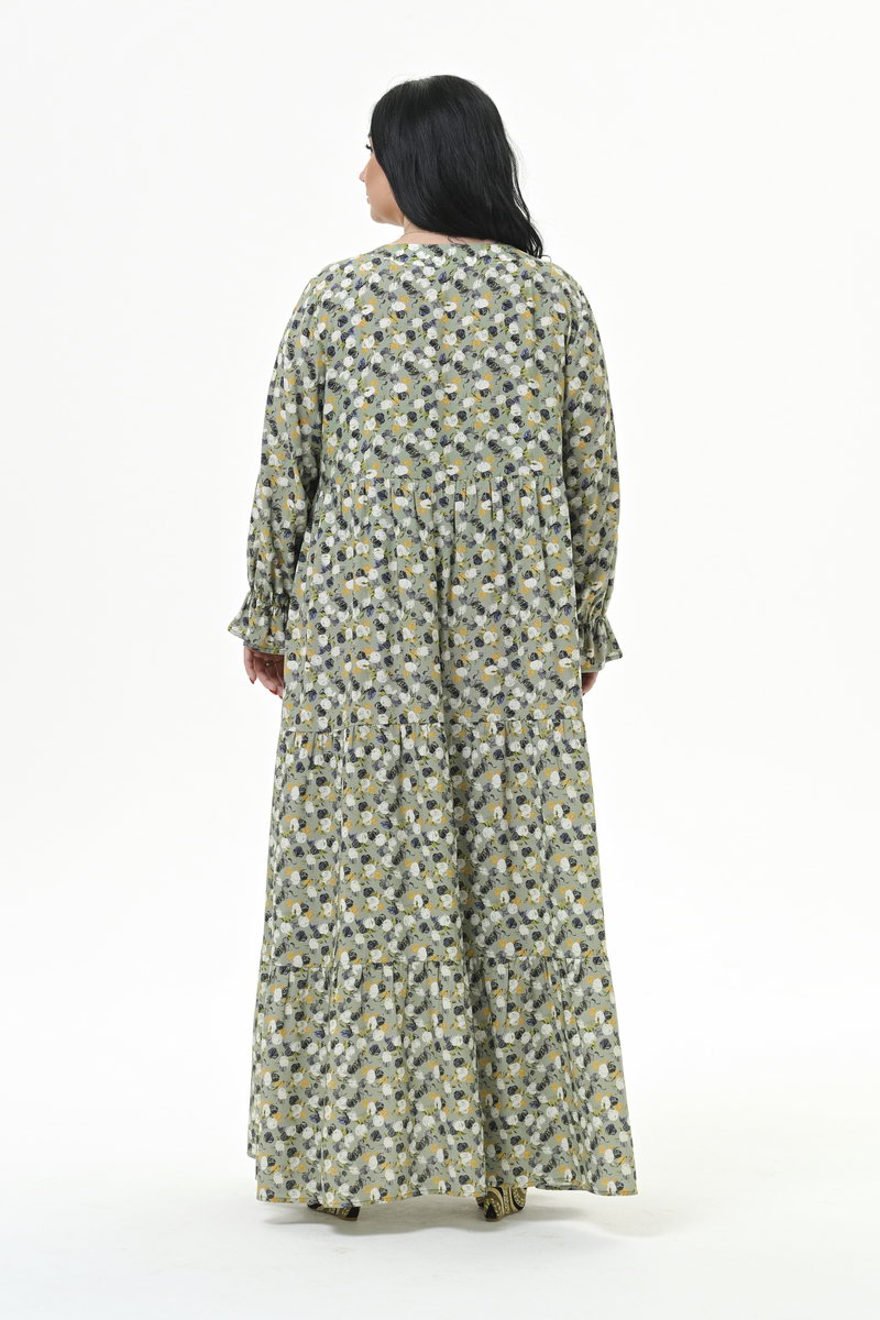 Роскошное, каскадное, длинное платье с тунисским вырезом горловины, из штапеля. Верхняя часть отрезная.