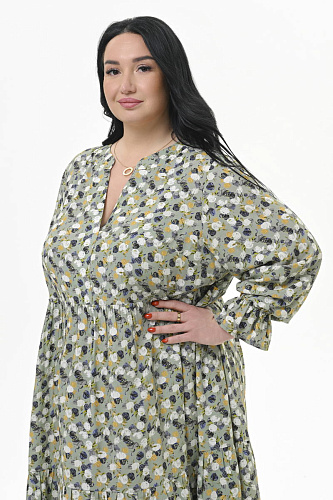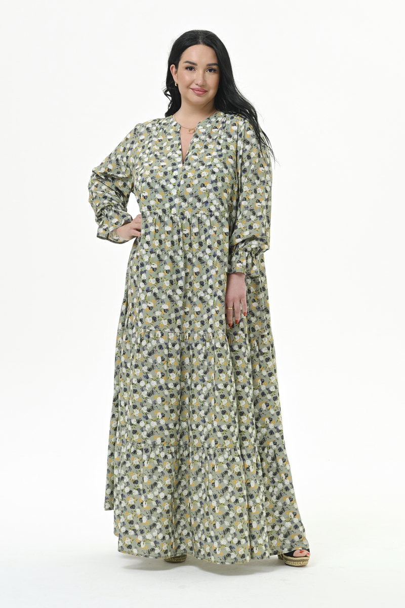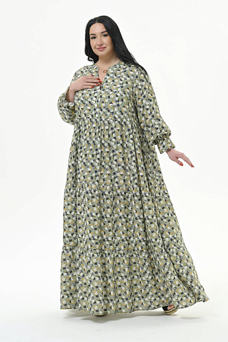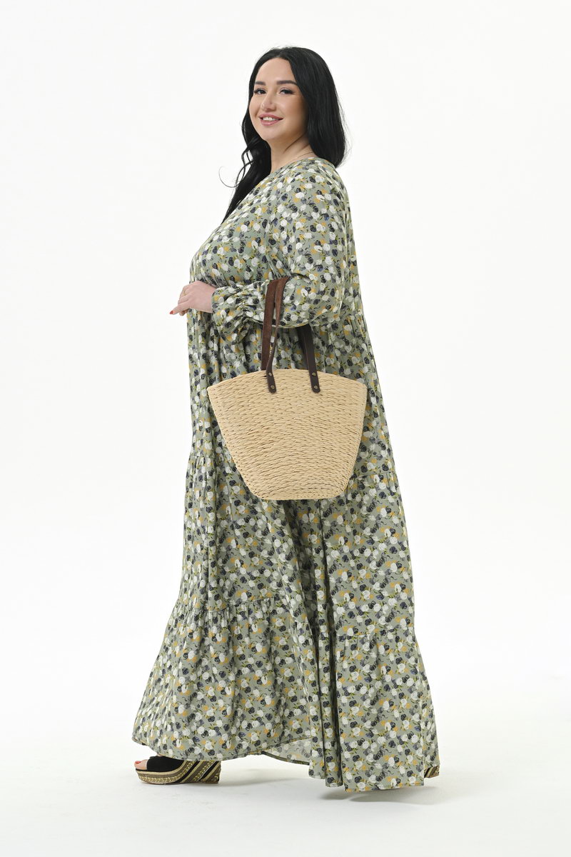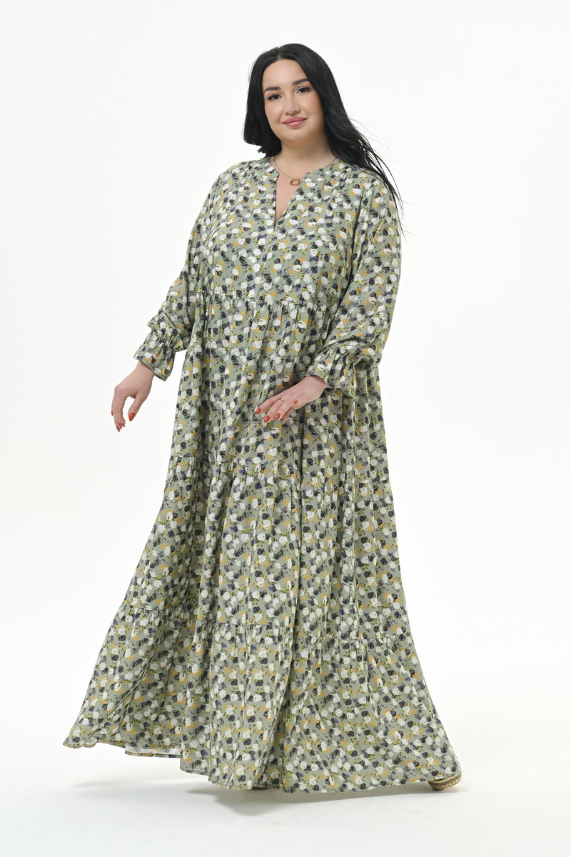Роскошное, каскадное, длинное платье с тунисским вырезом горловины, из штапеля. Верхняя часть отрезная. Нижняя часть состоит из 3-частей, каждая из которых присборенная и образует каскадную струящуюся юбку. По горловине платья планочка, образующая V-вырез, и плосколежащая стоечка. Рукав втачной, свободный, на резиночке по низу, образующей рюшь. Ткань: 100% вискоза. Цвет - мультиколор * длина изделия по центру спинки 143 см Размеры сдвоенные. На модели представлен размер 60/62. Параметры модели: - рост 172 см - обхват груди 120 см - обхват бедер 122 см.