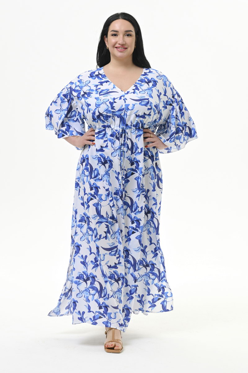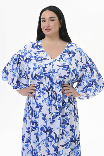 Легкое, оригинальное, свободное, длинное платье из 100% вискозы. Верхняя часть переда с V - вырезом. Под линией груди кулиса, с помощью которой можно самостоятельно моделировать силуэт за счет натяжения шнурочка. Линия плеча спущена, к ней притачан волан, образующий красивый, свободный рукав. По боковым швам разрезы. Платье идеально для жарких дней, подойдет в качестве пляжного. Ткань – 100% вискоза Цвет - мультиколор * длина по центру спинки 140 см. Рост модели 172 см. На модели представлен размер 60/62. Размеры сдвоенные.