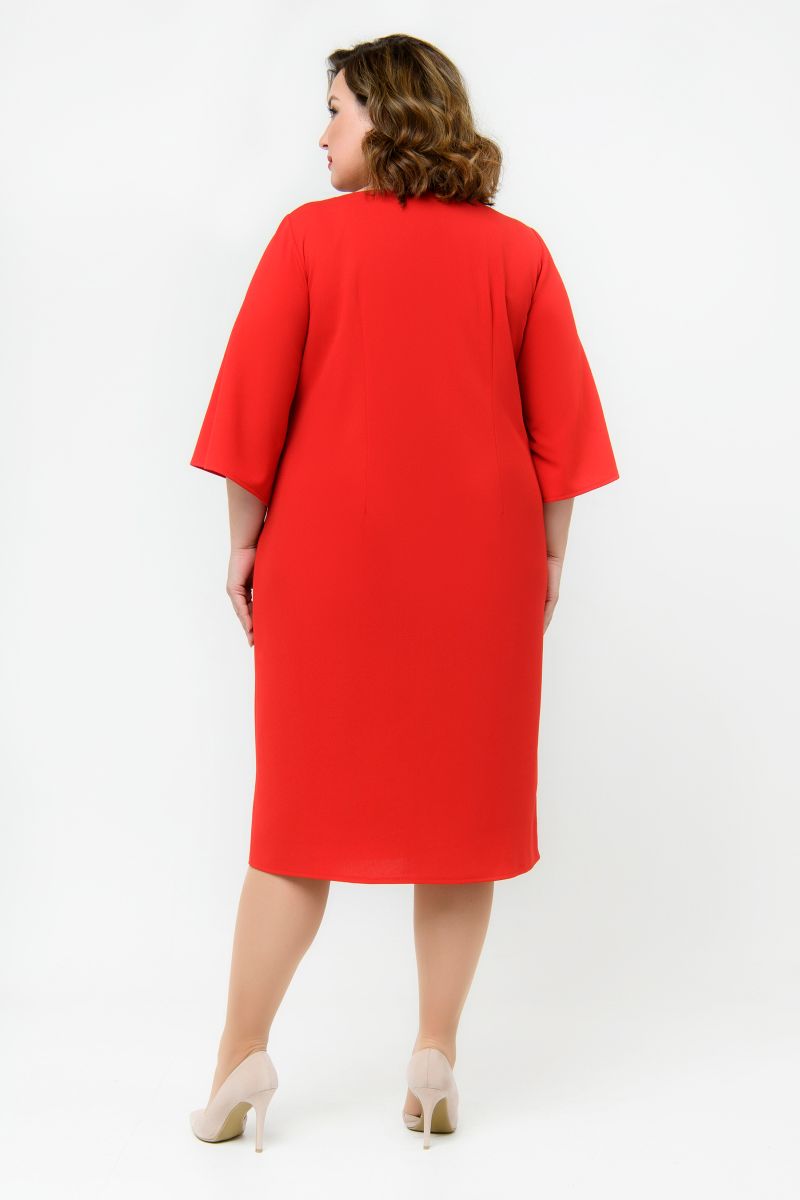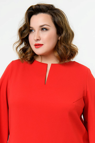 Офисное платье-футляр полуприлегающего силуэта. Вырез горловины рассечен и обработан обтачкой, образуя красивую четкую линию, визуально вытягивающую шею. Рукава свободные расширенные, закрывают локоть. * длина изделия по спинке 110 см Ткань – креп, состав: 65% вискоза, 30% полиэстер, 5% эластан. Цвет - красный. Рост модели 172 см. На модели представлен 62 размер.