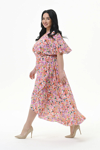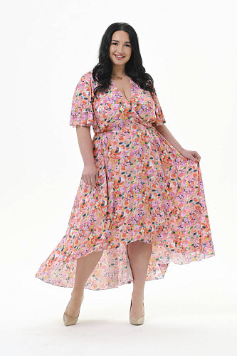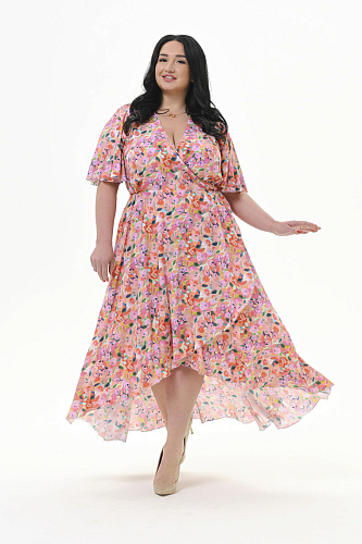 Восхитительное платье из 100% вискозы - это настоящая ода лету. Оно прекрасно и непосредственно, отличается необычным кроем и совершенством конструкции. Здесь обЪединены деликатность, чувственность и шик. Мягкие фалды юбки гармонично сочетаются с плавными линиями свободного рукава «крылышко». Юбка  с запАхом и асимметричной линией низа выполнена в соответствии с последними тенденциями моды.  По талии резинка, не стесняющая движений, но одновременно прорисовывающая линию талии.
