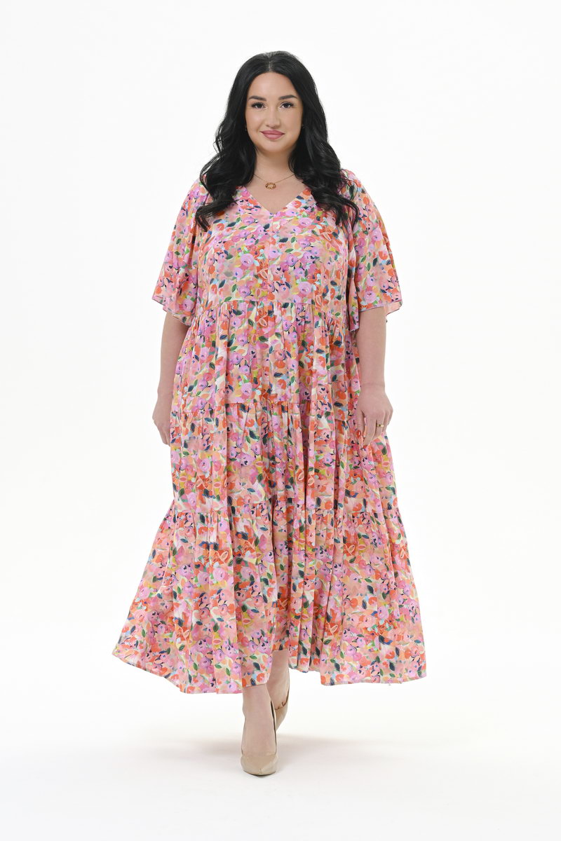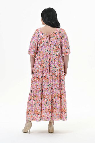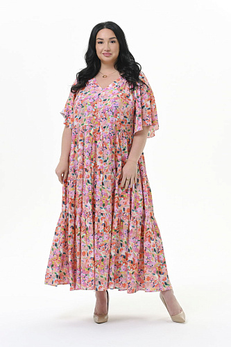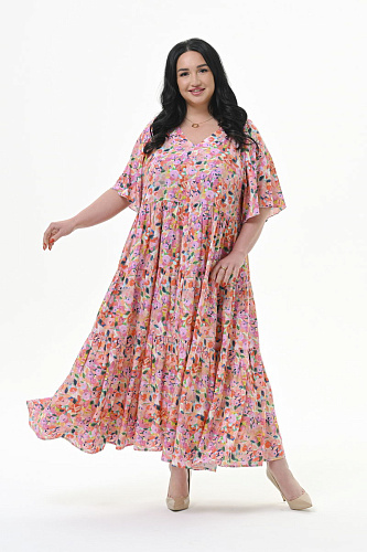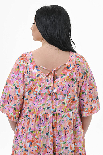Платье из штапеля свободного силуэта. Отрезное по линии груди, нижняя часть платья присборена. По горловине переда и спинки V-вырез, на спинке завязывается на шнурочек. Рукава "крылышки". Состав ткани: 100% - вискоза. Цвет: мультиколор * длина по спинке от плеча 133 см Размеры сдвоенные. На модели представлен размер 60/62.
