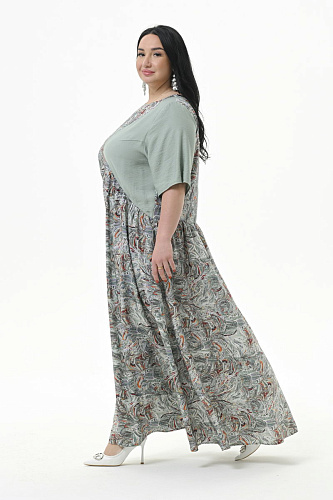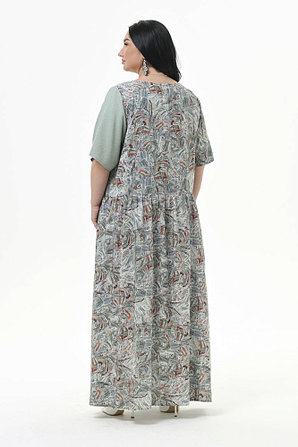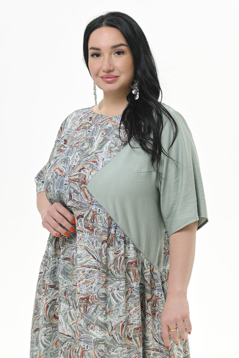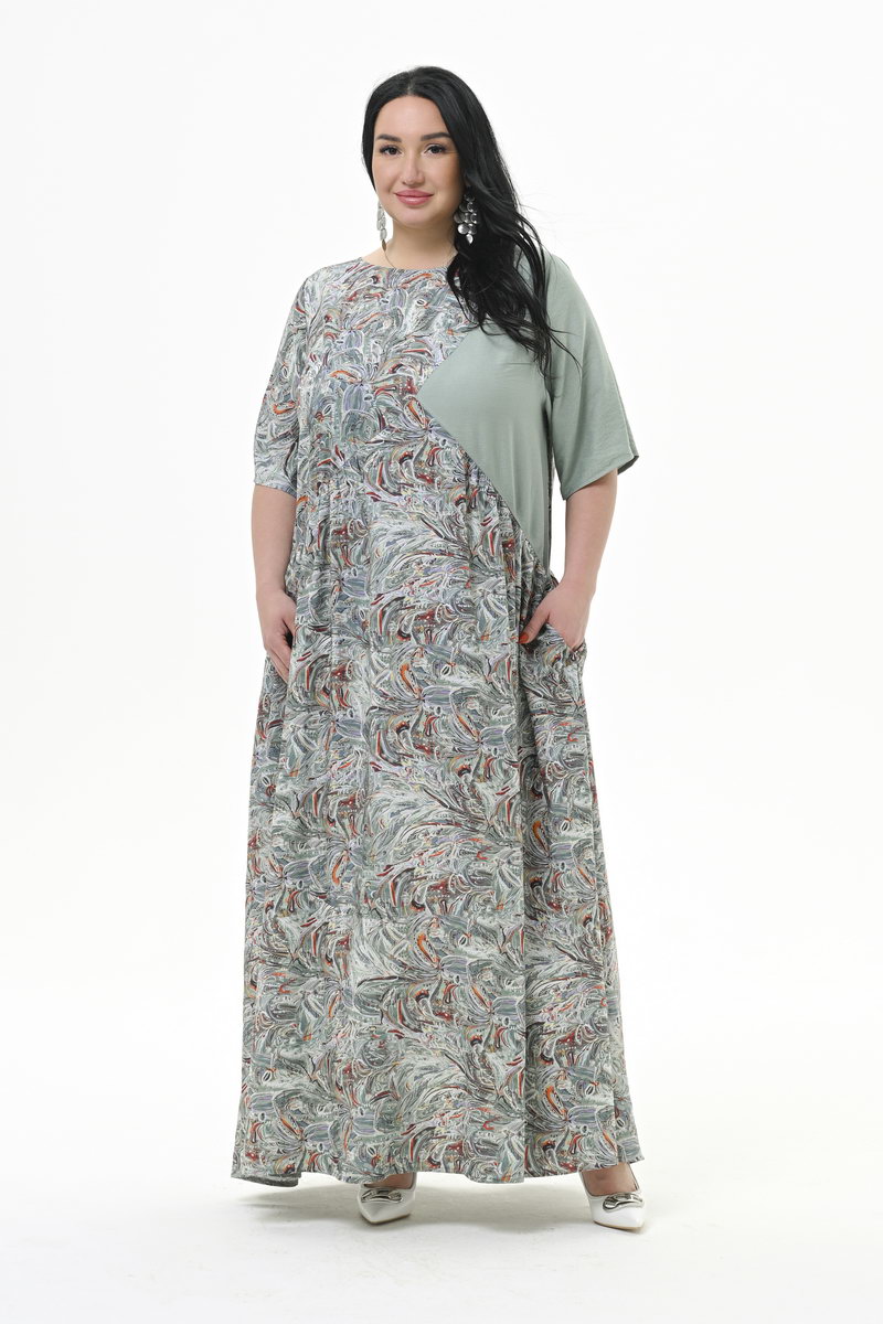 Платье длинное, свободного силуэта, из штапеля. Нижняя часть платья отрезная, присборенная. Линия подреза по переду фигурная, по спинке горизонтальная. Левая часть переда и левый рукав из отделочной однотонной ткани. В боковых швах карманы. Рукав втачной, свободный. Состав: 100% вискоза - основная ткань; 80% вискоза, 20% полиэстер - отделочная ткань. Цвет - мультиколор. Длина платья по центру спинки 139 см. Длина рукава от горловины 33 см. Рост модели 172 см. Параметры модели: обхват груди 120см, обхват бедер 122 см. На модели представлен 60 размер.
