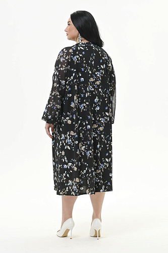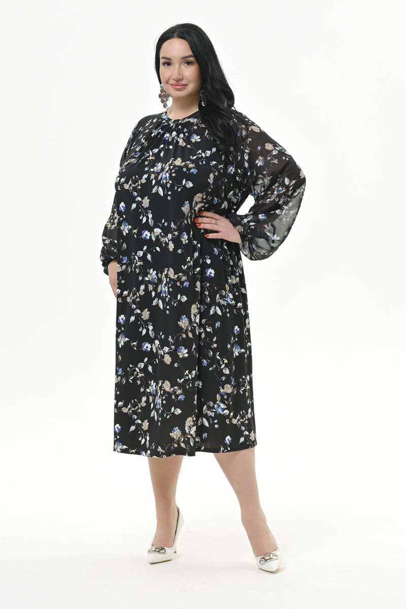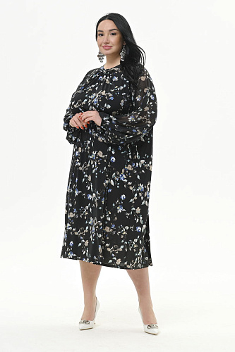 Платье А-силуэта с рукавом реглан. Основа платья, планочка обработки горловины и манжеты выполнены из струящегося трикотажа - "масло", рукава из шифона-компаньона. Ткани абсолютно одинакового оттенка. Ткань - трикотаж "масло", состав: 70% полиэстер; 25% вискоза; 5% эластан. Шифон для рукавов - 100% полиэстер. Цвет - мультиколор. Длина по центру спинки 118 см. Рост модели 172 см. На модели представлен 60 размер.