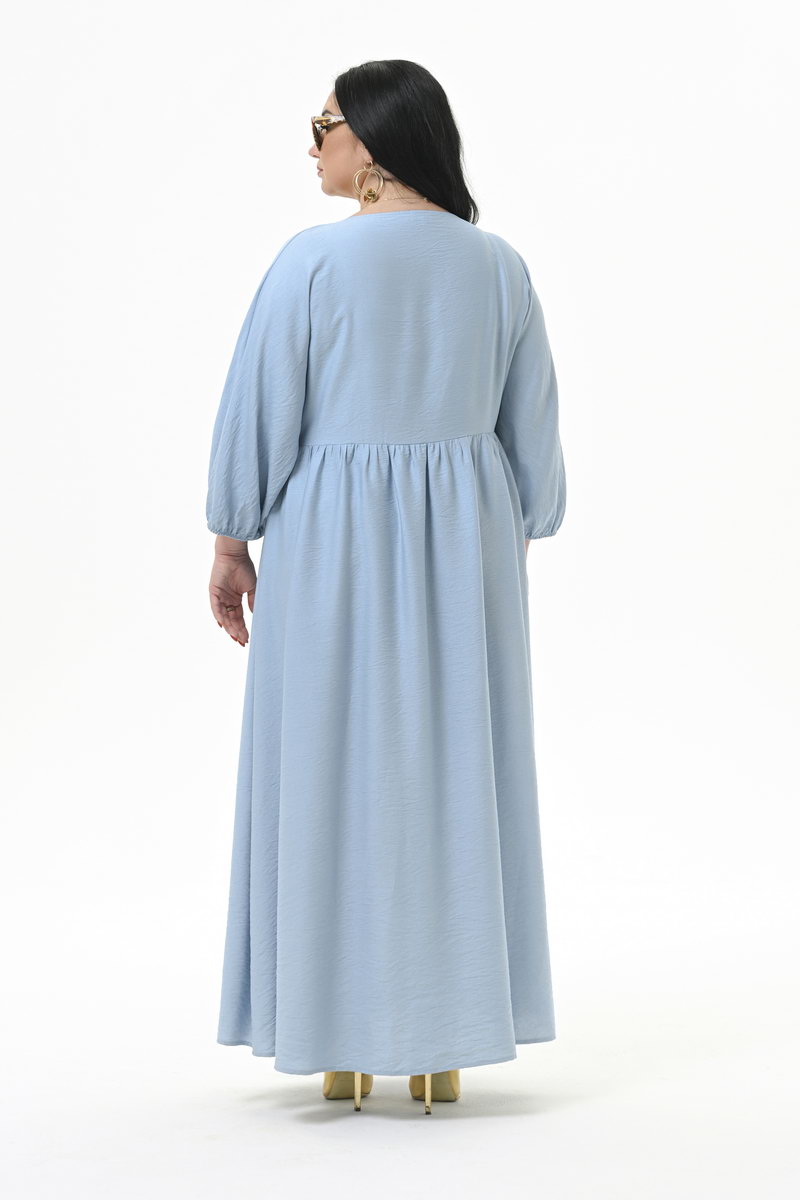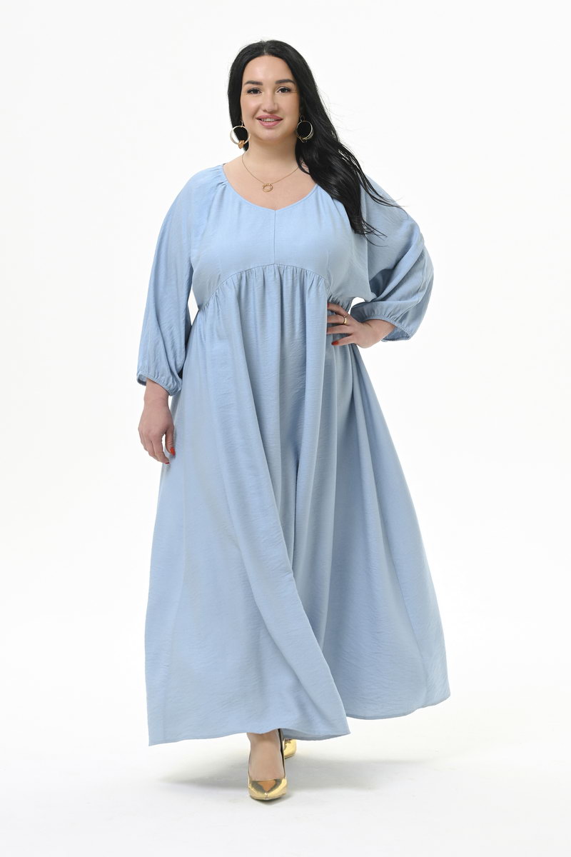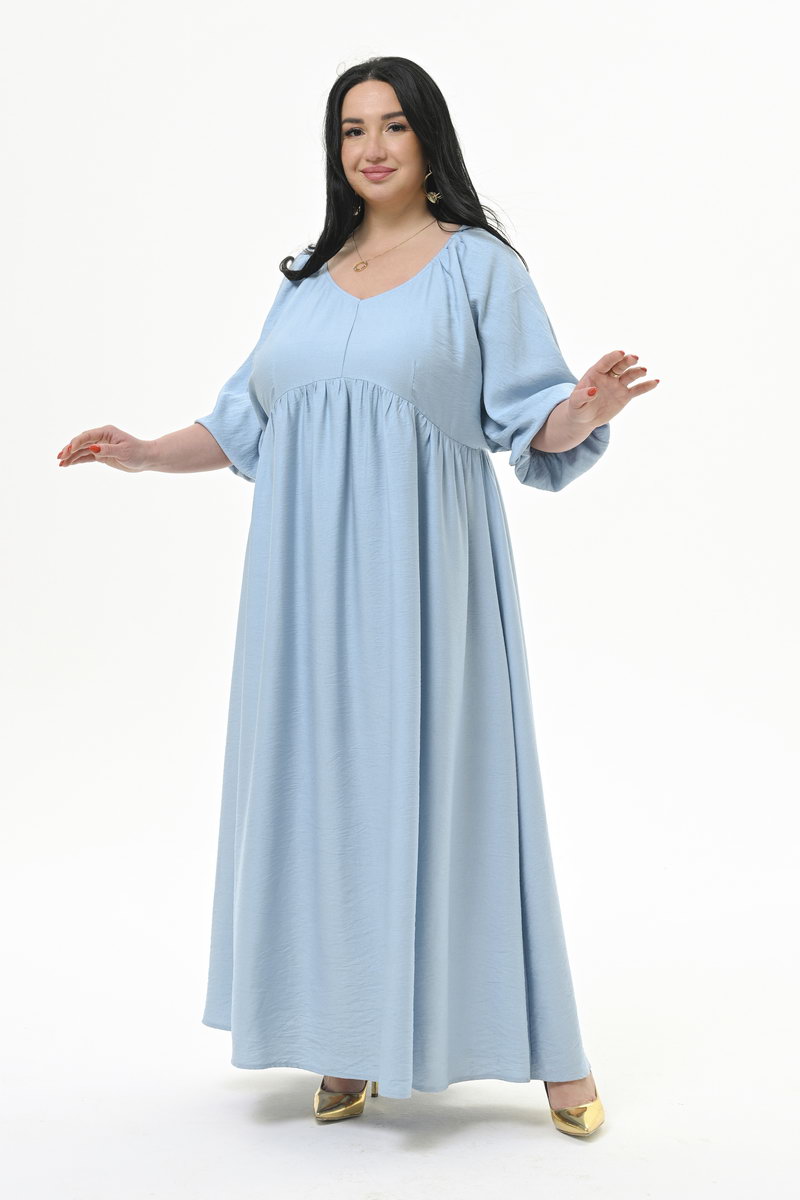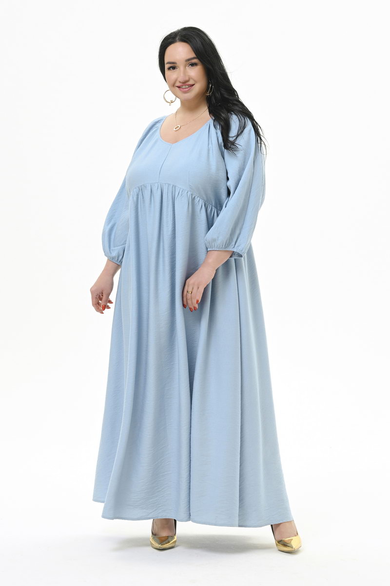Роскошное, свободное, длинное платье из фактурной плательной вискозы. По переду V-вырез "мягкой" формы.На уровне линии груди плавный подрез, переходящий на спинке в ровную линию. Нижняя часть платья присборенная. Рукав цельнокроенный, свободный, по низу на резиночке. Ткань платья легкая, но вместе с тем прочная, с рельефной поверхностью.Приятная и мягкая на ощупь, обладает матовым блеском и красиво смотрится в изделии. Вискоза, входящая в состав ткани, придает полотну мягкость и воздухопроницаемость, делает его приятным на ощупь, а полиэстер препятствует сминаемости. Материал хорошо подходит для создания повседневного гардероба благодаря своей способности сохранять безупречный внешний вид в течение дня. Если платье помялась, ему достаточно дать отвисеться на вешалке около часа и оно снова приобретет идеальный внешний вид. Состав ткани: 80% - вискоза; 20% - полиэстер. Цвет: голубой. * длина изделия = 143 см. Рост модели 172 см. На модели представлен размер 60/62.